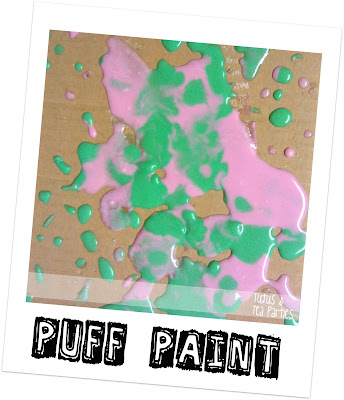 It is supposed to be a rainy week here! Paint is a great indoor activity that can keep your tot entertained for either minutes, or an hour! Puff paint is super easy to make and it is so fun to paint with! Bug lasted a whopping 45 minutes with this stuff {normally she is done painting in 5 mins}. The texture also makes it a great sensory experience for your little one {if you let them touch it}. It is so easy to clean because it is made with flour, salt, & water. It basically rinses right off!